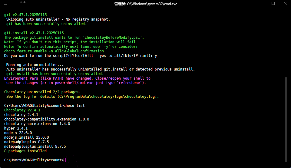 -s、--source:使用指定的源名称(windowsfeatures、ruby、cygwin、python 等)查找包。-f、--force:强制安装,忽略已安装的相同版本。-d、--debug:启用调试模式。-v、--verbose:启用详细输出(verbose logging)。-y, --yes, --confirm:确认所有提示。--params="":传递给软件包的参数。--install-arguments="":安装参数,直接传递给程序。