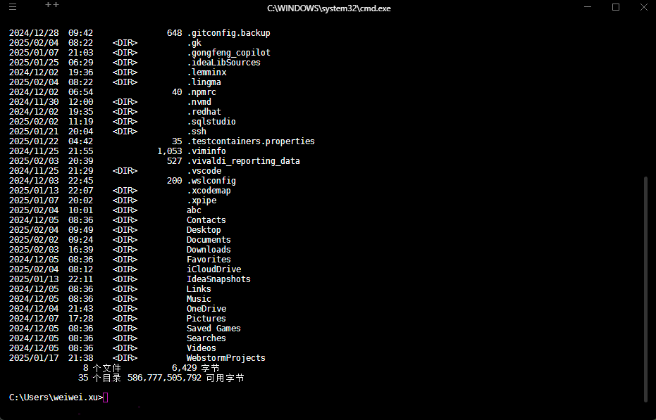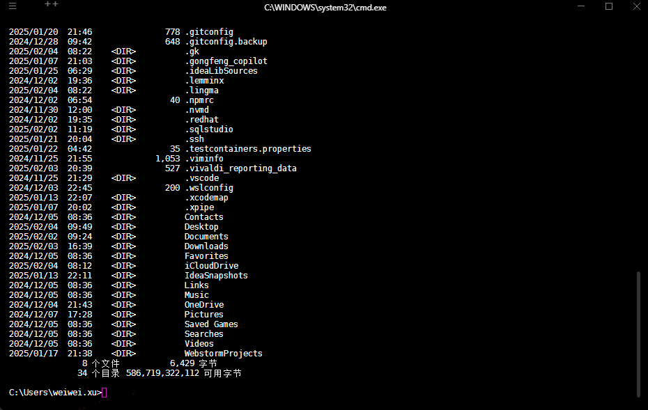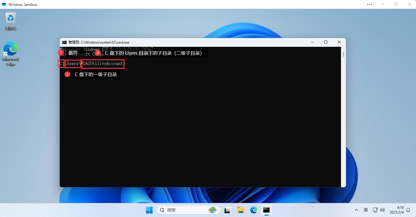 - ① 命令行提示符:命令提示符是命令窗口中的一部分,表示当前系统状态和用户可以输入命令的位置,它通常会显示计算机的当前目录路径。