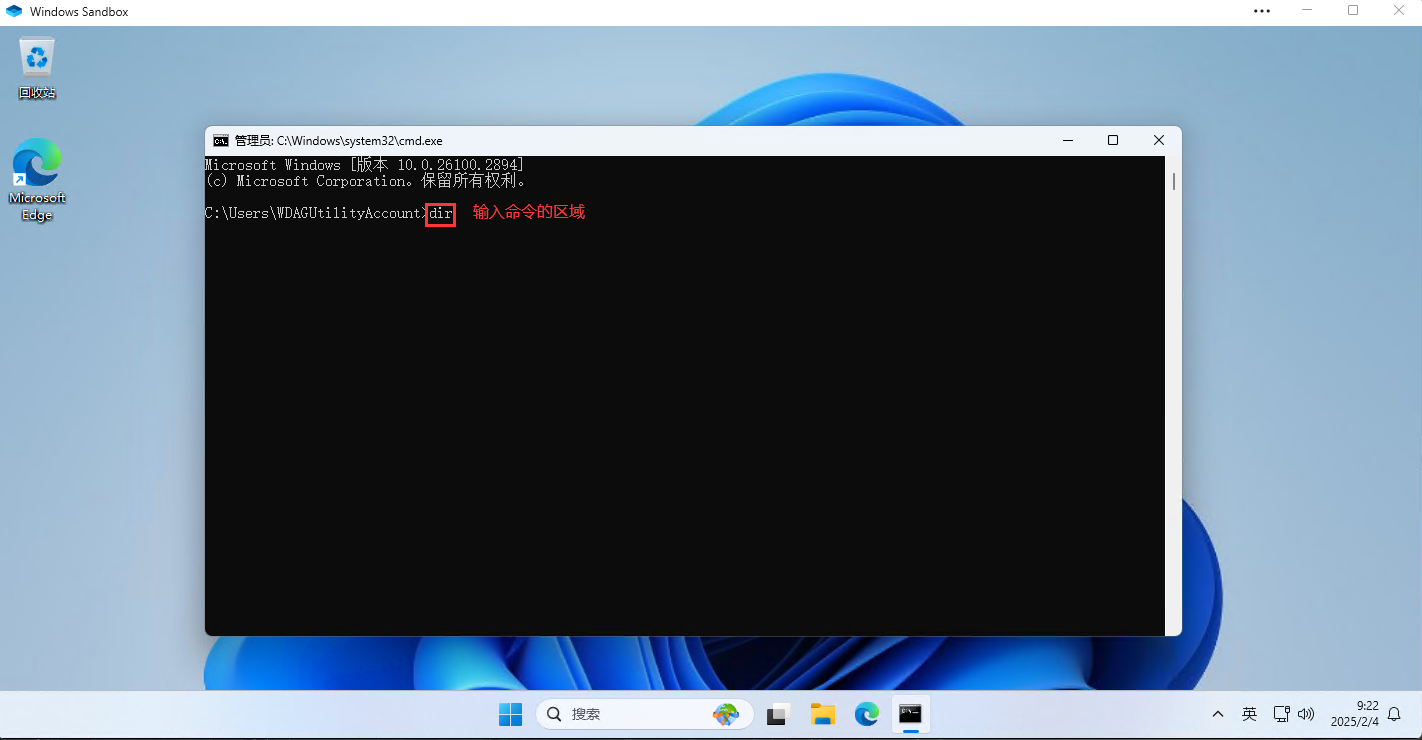 - ② 输入命令的区域:在提示符后,用户可以输入 DOS 命令。