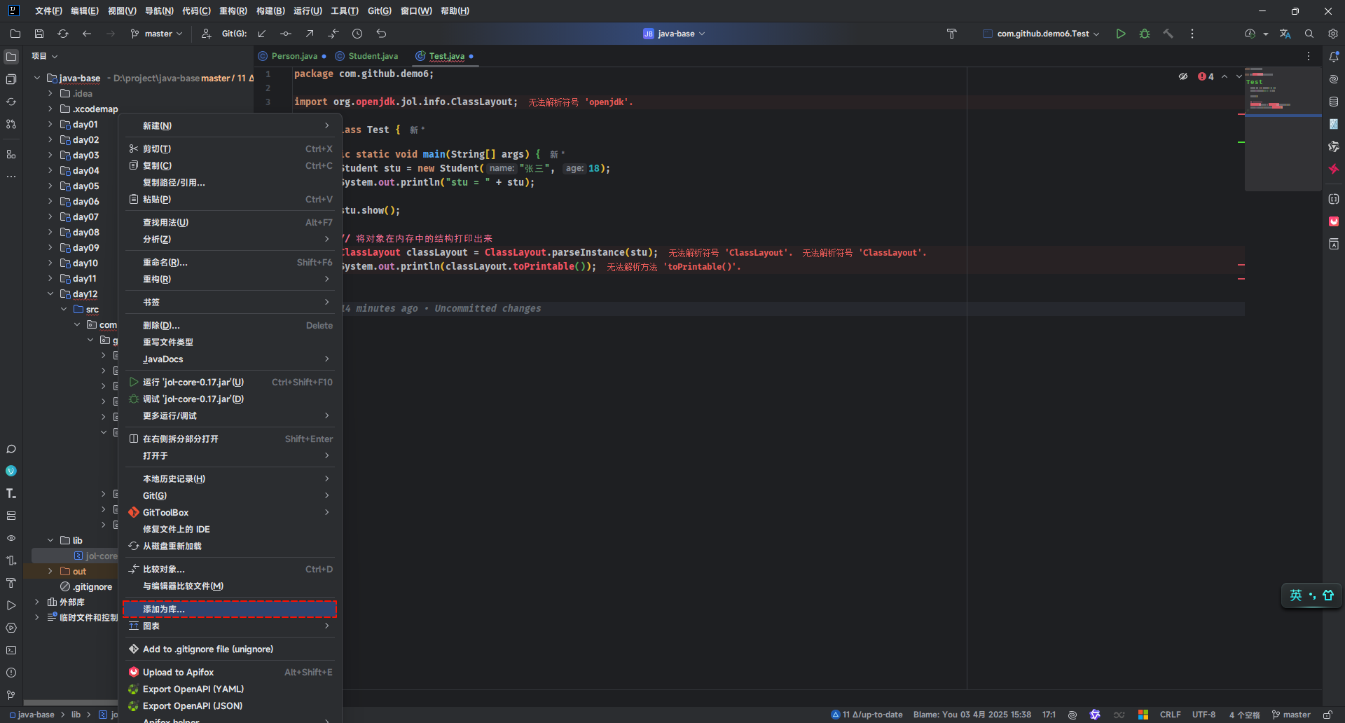 项目结构-->项目设置-->依赖中,将刚才的库文件导入到类路径中,以便 IDEA 识别,如下所示: