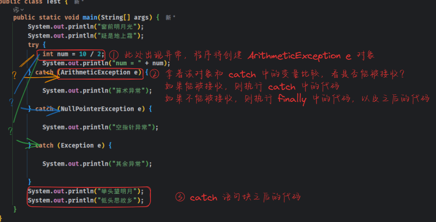 thorw new 异常类(xxx);后面的代码将不再执行。 - ③ 方法的调用者要么进行异常捕获处理,要么使用 throws 声明处理,当然也可以通过 throw 关键字继续抛出异常。