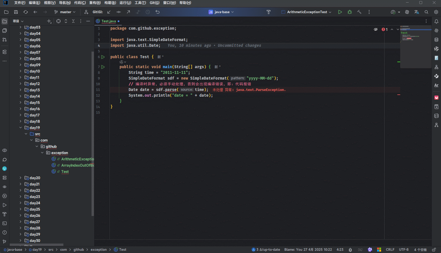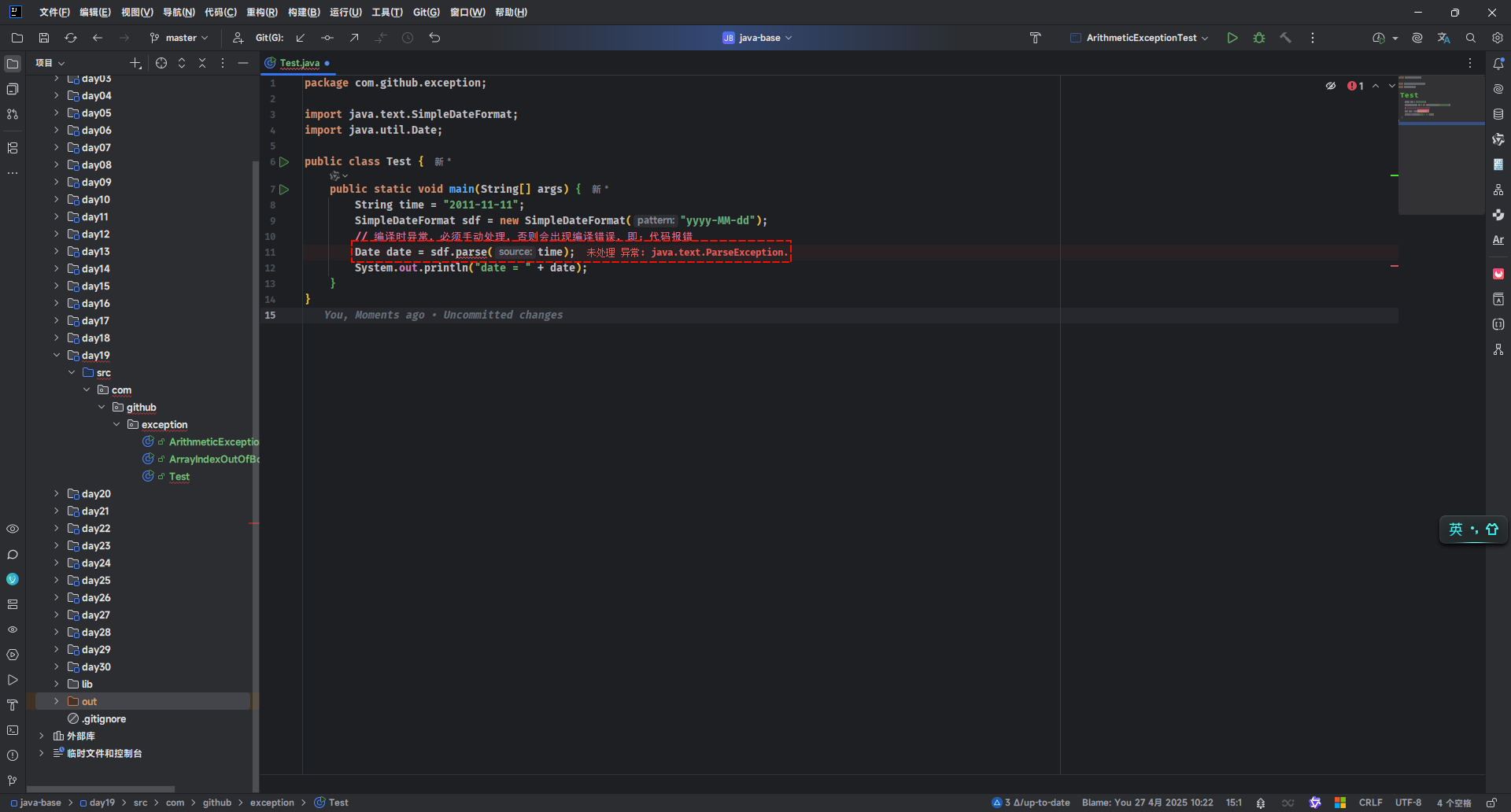 - 编译时异常(CheckedException,非 RuntimeException):编译阶段就会出现异常提醒的,如:日期解析异常。