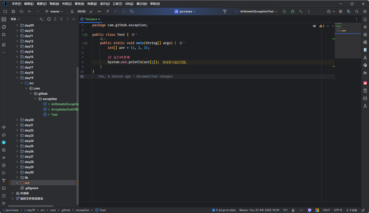 - 运行时异常(RuntimeException 及其子类):编译阶段不会出现异常提醒,运行的时候出现的异常,如:数组索引越界异常。