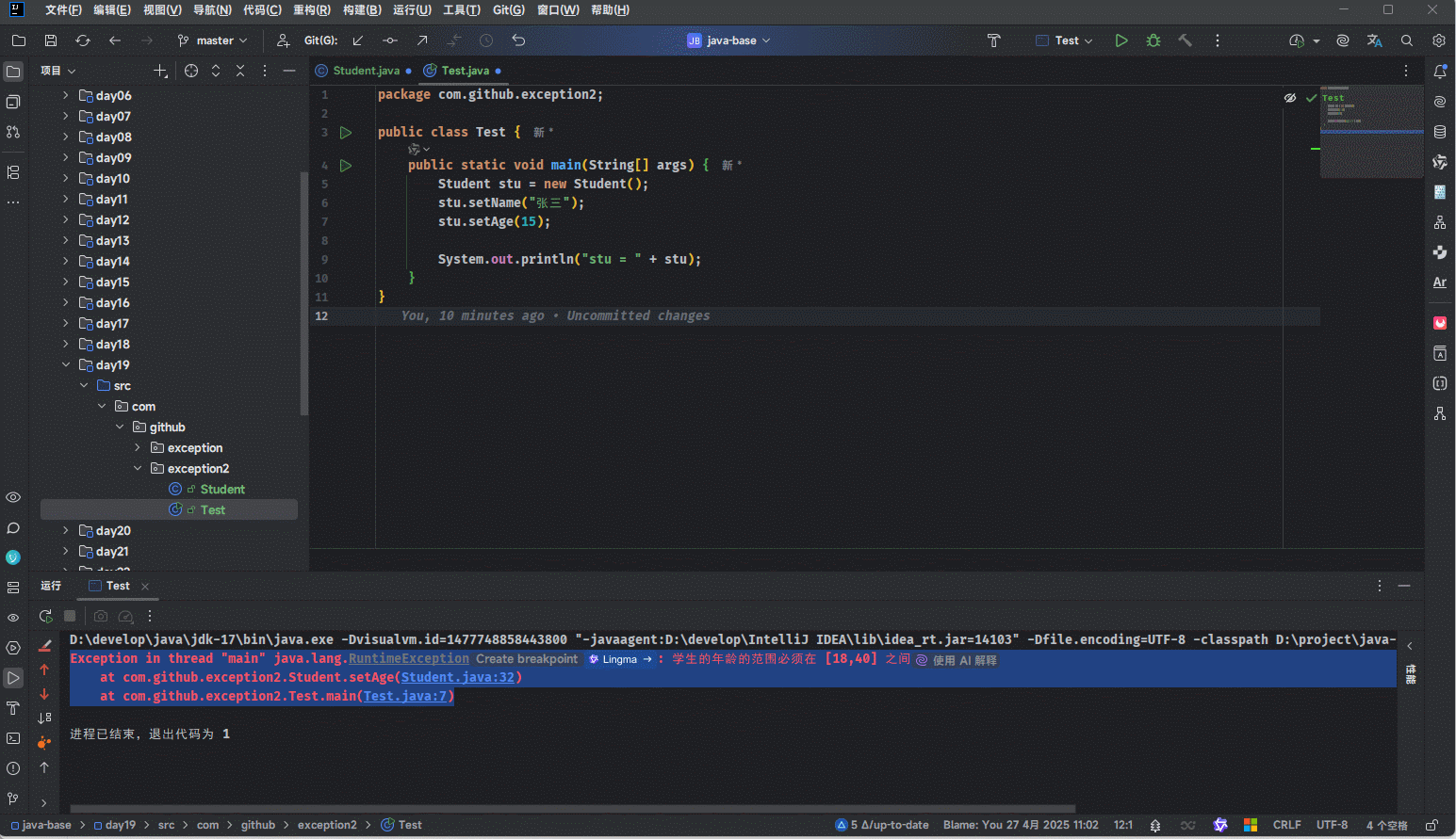 throw new AgeOutOfBoundsException("年龄的范围必须在 [18,40] 之间");