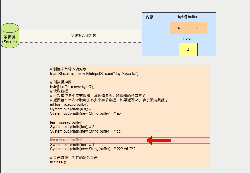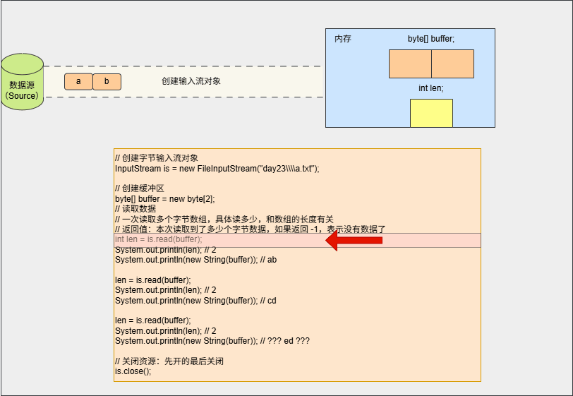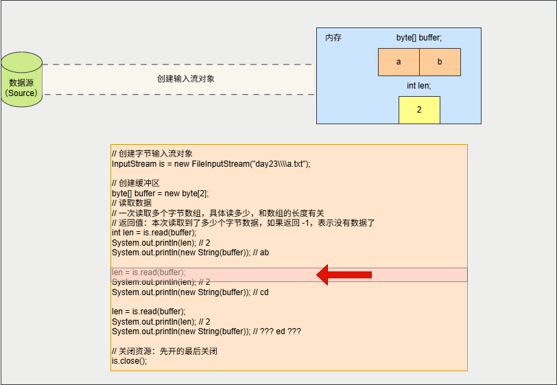 - ① 将读取到的数据存储到缓冲区中,即:buffer 数组中是
